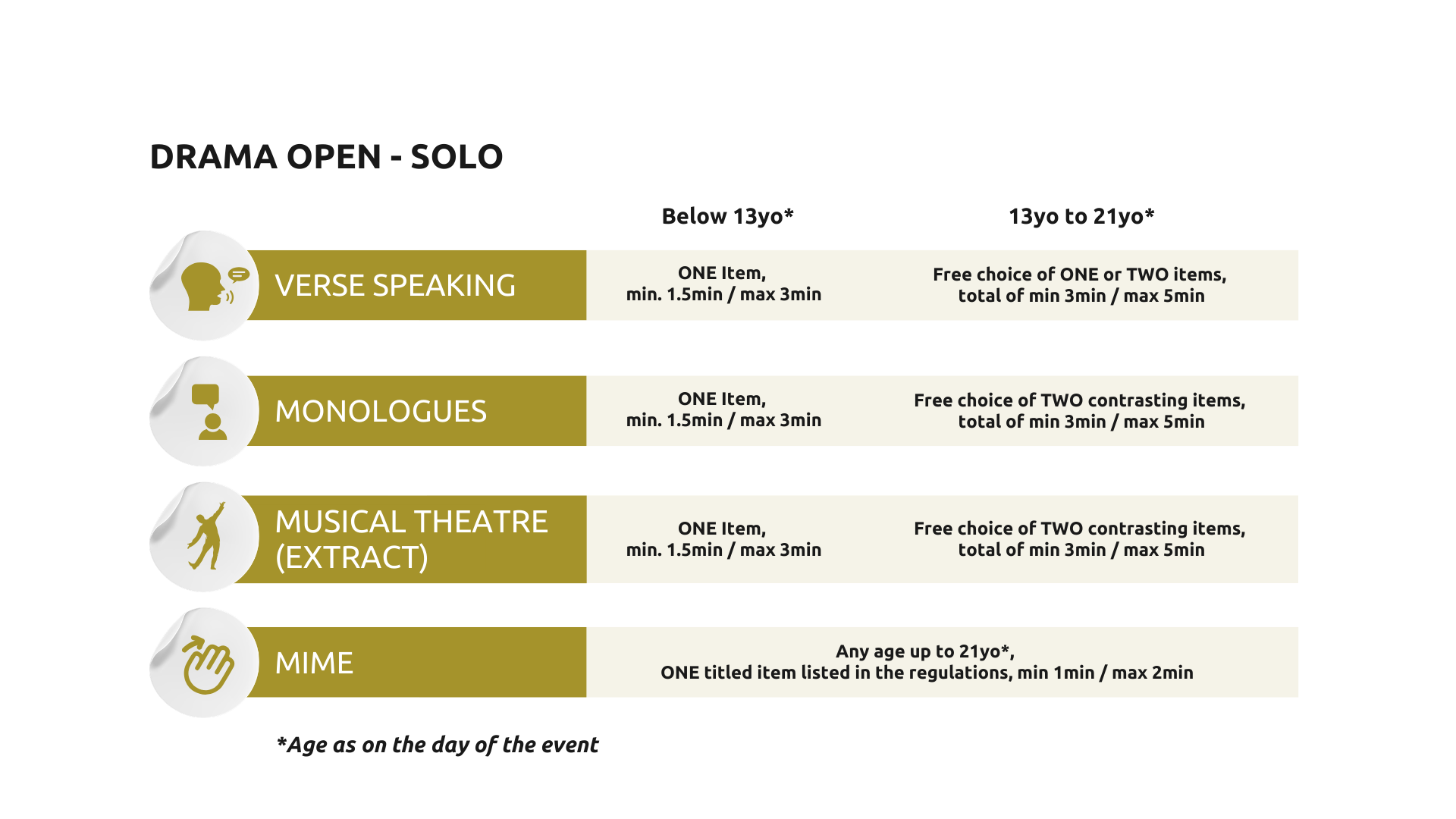 The drama item is all free-choice, except for Mime, which has specific themes listed in the Rules and Regulations.
