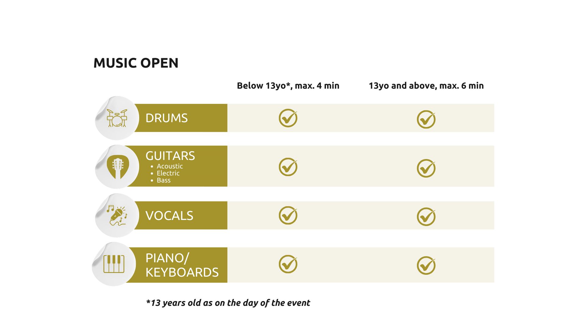 Select an instrument and perform ONE free-choice piece, of any genre, according to your age category and following the time-limit given.