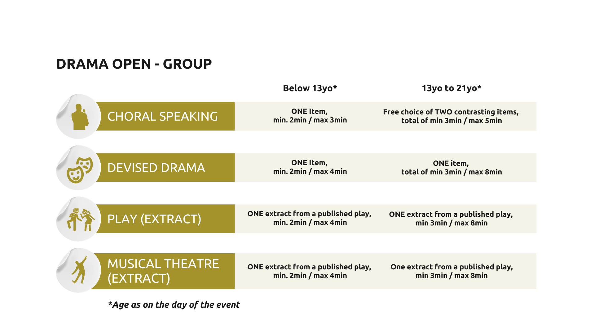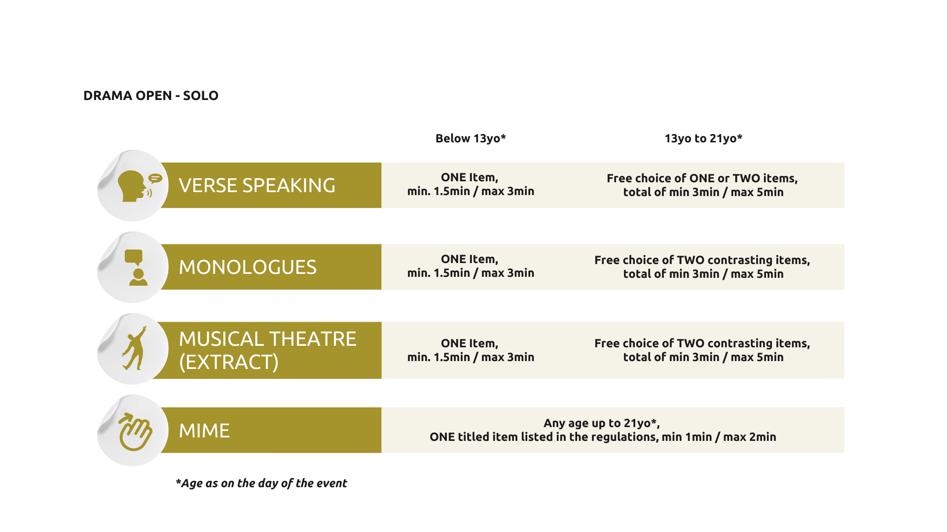 This is a single-stage competition, only offered as a live performance at selected venues listed, where you perform a music or drama item.